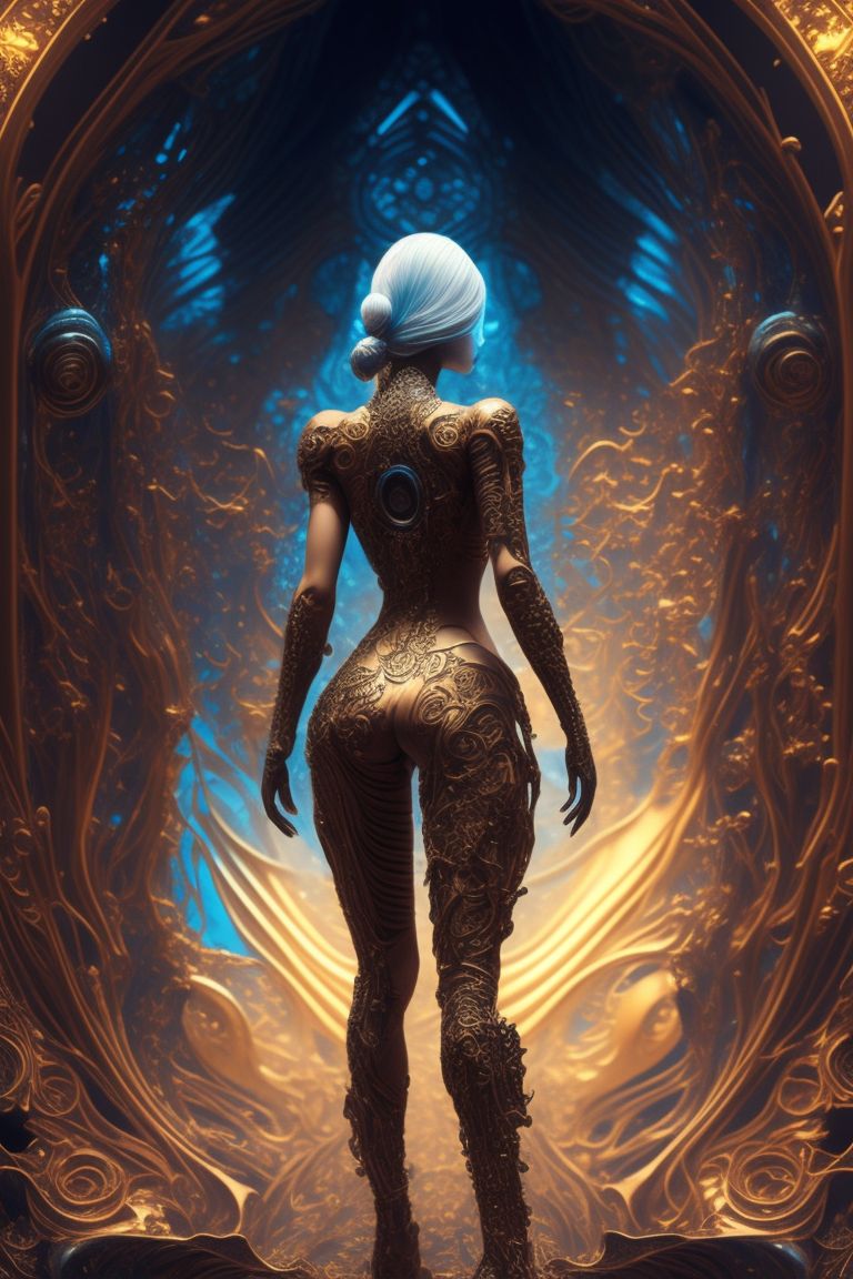 Profuse Ape499 Machine Body Full Body Ultra Detailed Artistic Abstract Photography Of A Beautiful Cyborg Woman Exposed Legs Perfect Anatomy Ultra Detailed Artistic Photography Back View Wearing Short Clothing Whith Gold Lines Black